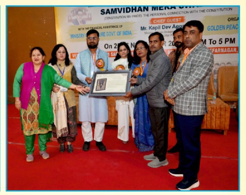 A moment of honor as Mohammad Shahabuddin, Founder of the Azizia Rahmani Educational and Welfare Foundation, receives the award in recognition of the Foundation’s commendable and outstanding work on Constitution Day 26 November 2025, at a programme organized by the Golden Peacock Foundation and supported by the Ministry of Culture, Government of India in Muzaffarnagar UP.